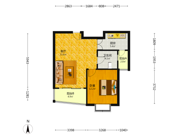 1室2厅1卫1厨1阳