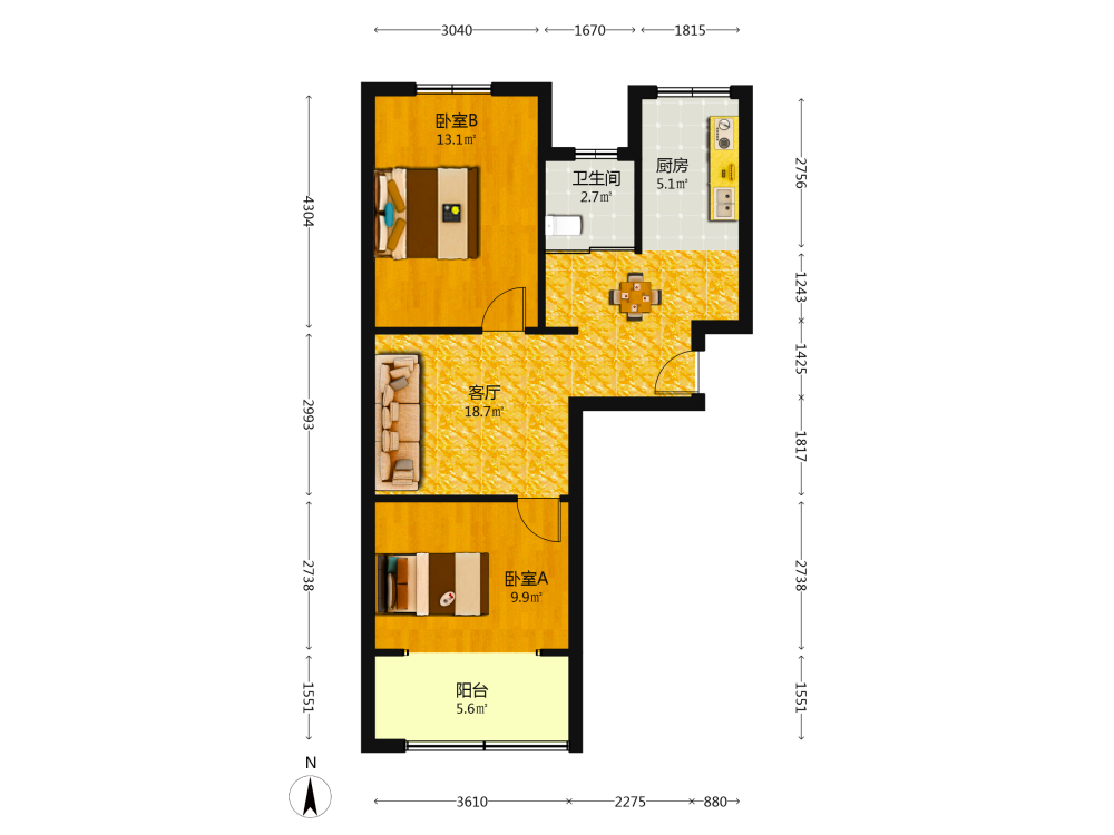 2室1厅1卫1厨1阳