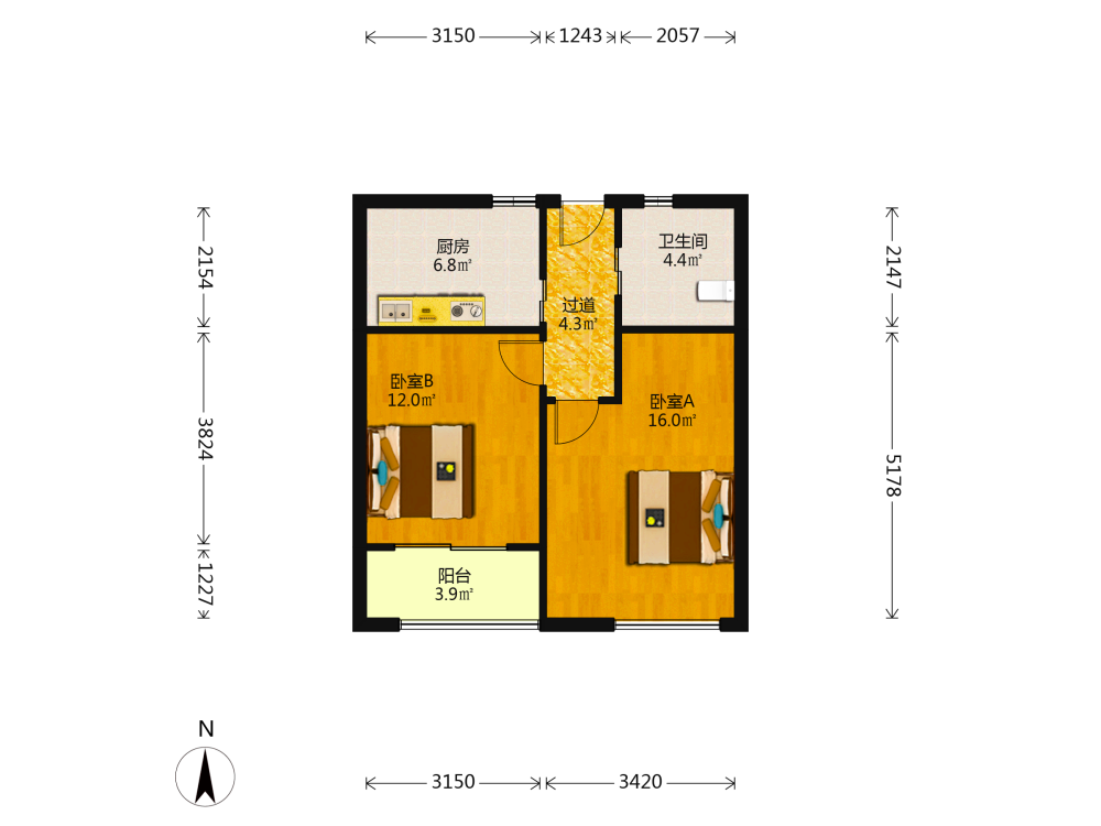 2室1厅1卫1厨1阳