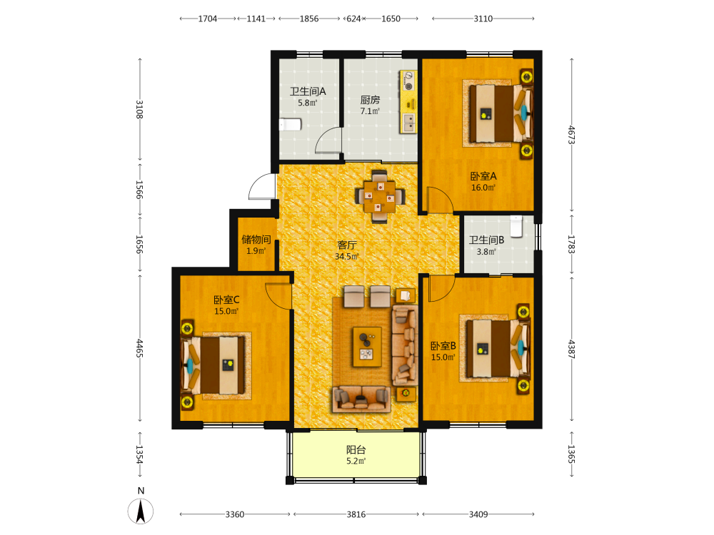 3室2厅2卫1厨1阳