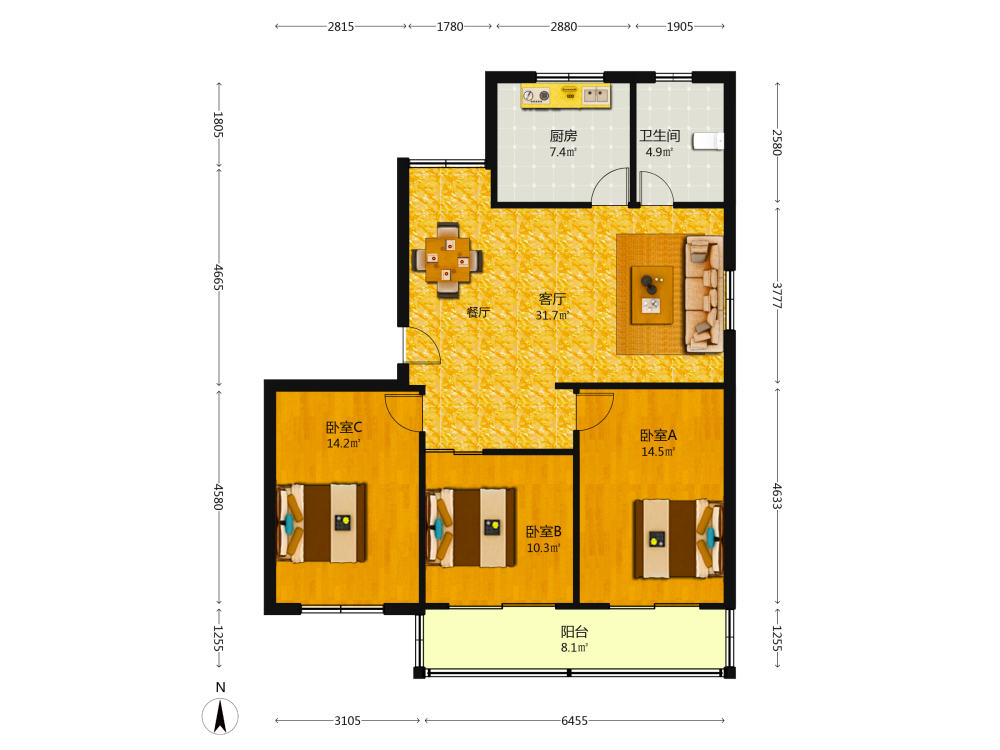 3室1厅1卫1厨1阳