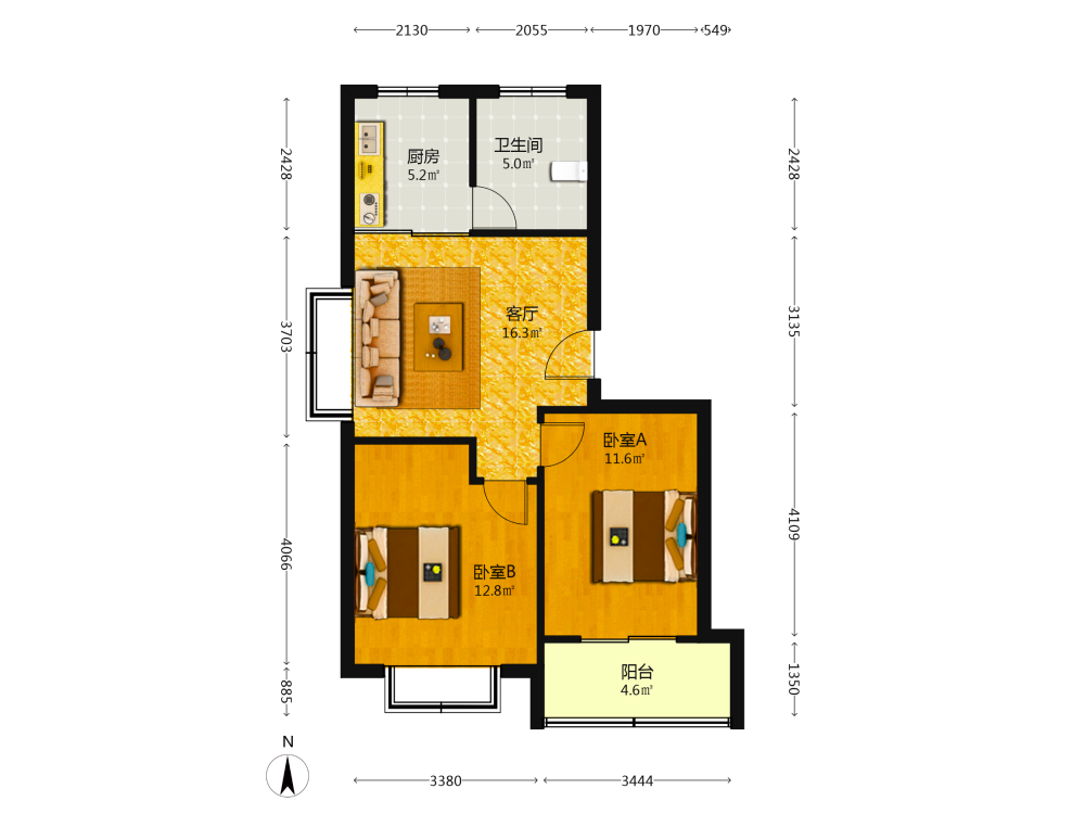 2室1厅1卫1厨1阳