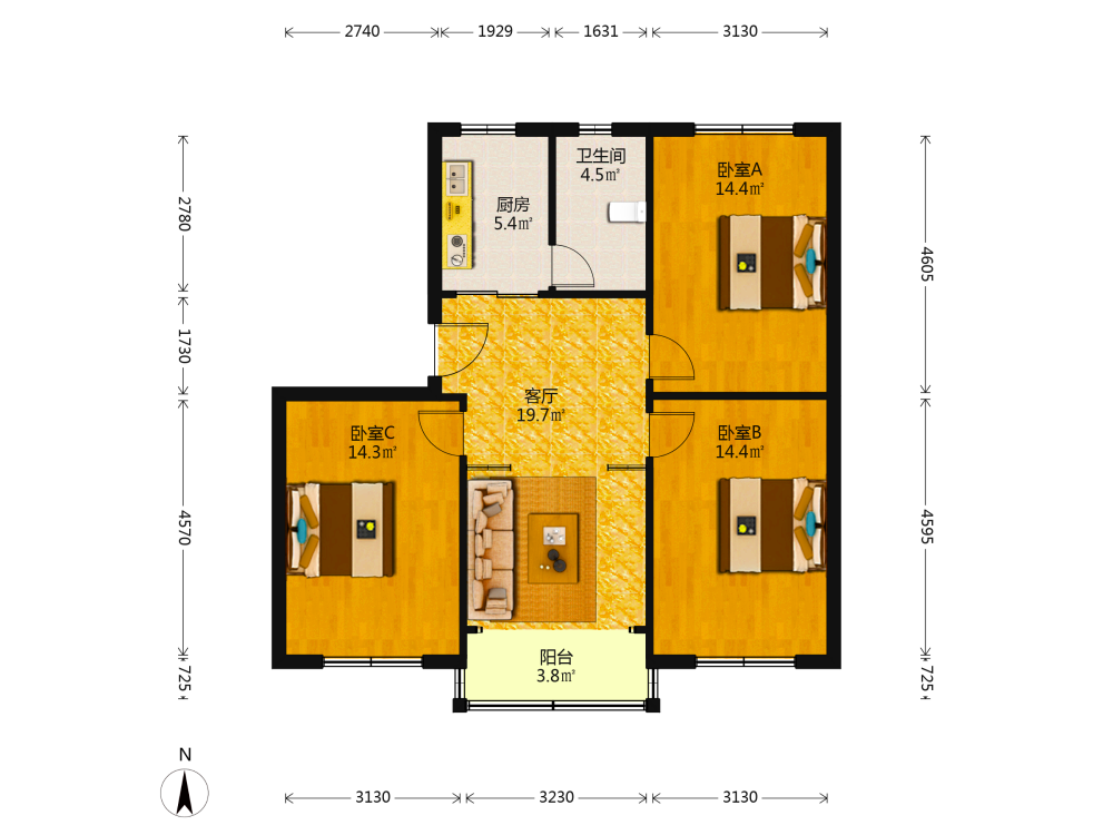 3室2厅1卫1厨1阳