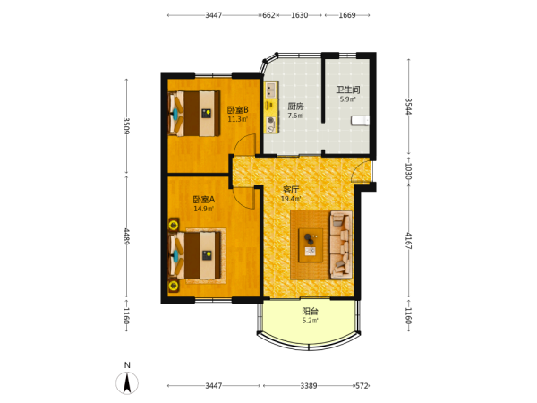 2室2厅1卫1厨1阳