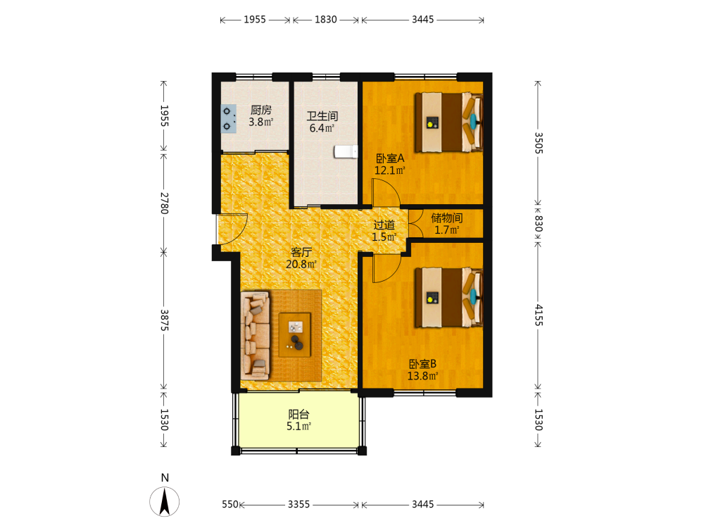 2室1厅1卫1厨1阳