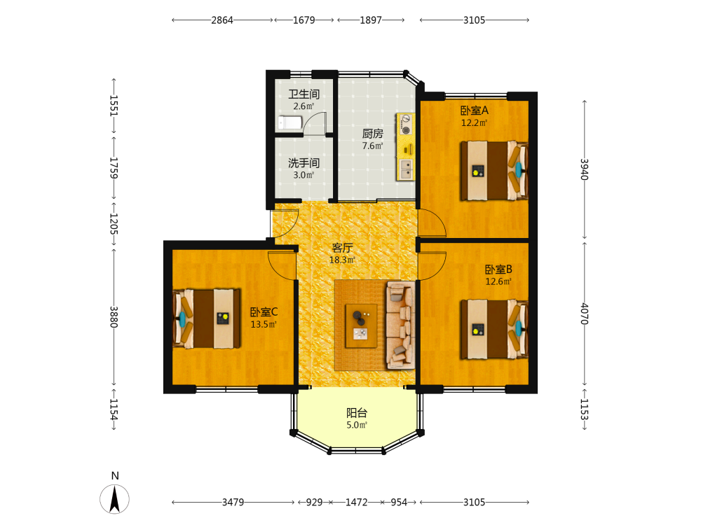 3室1厅1卫1厨1阳