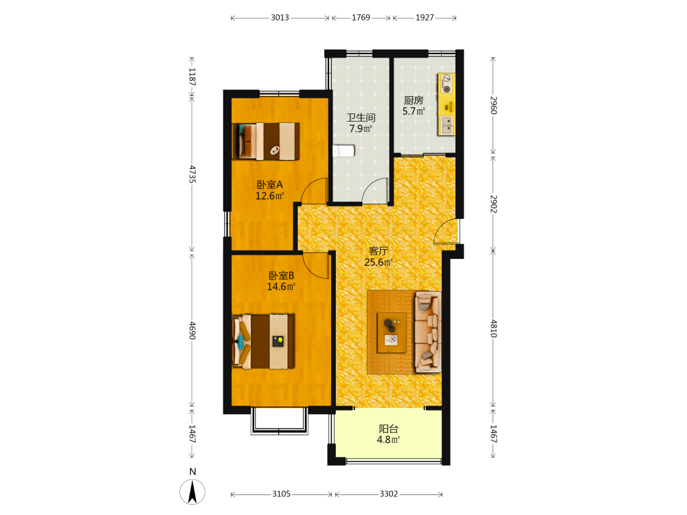 2室1厅1卫1厨1阳