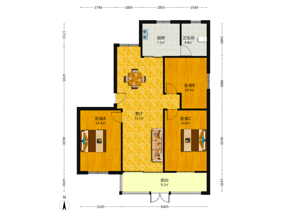 3室1厅1卫1厨1阳