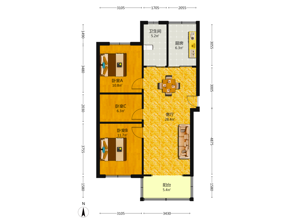 3室2厅1卫1厨1阳