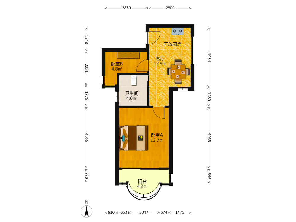 2室1厅1卫1厨1阳