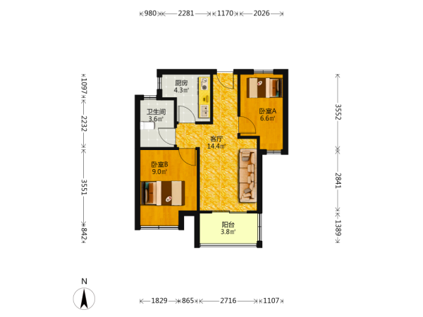 2室1厅1卫1厨1阳