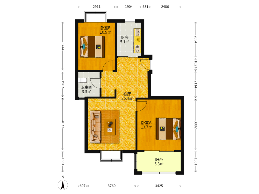 2室1厅1卫1厨1阳