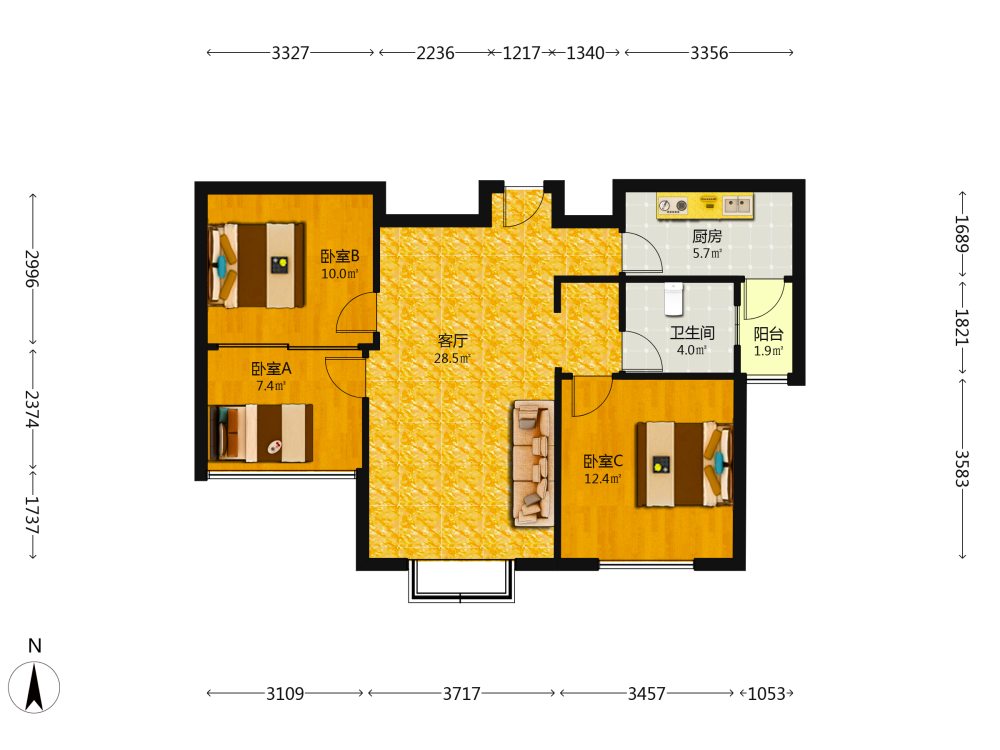 3室2厅1卫1厨1阳