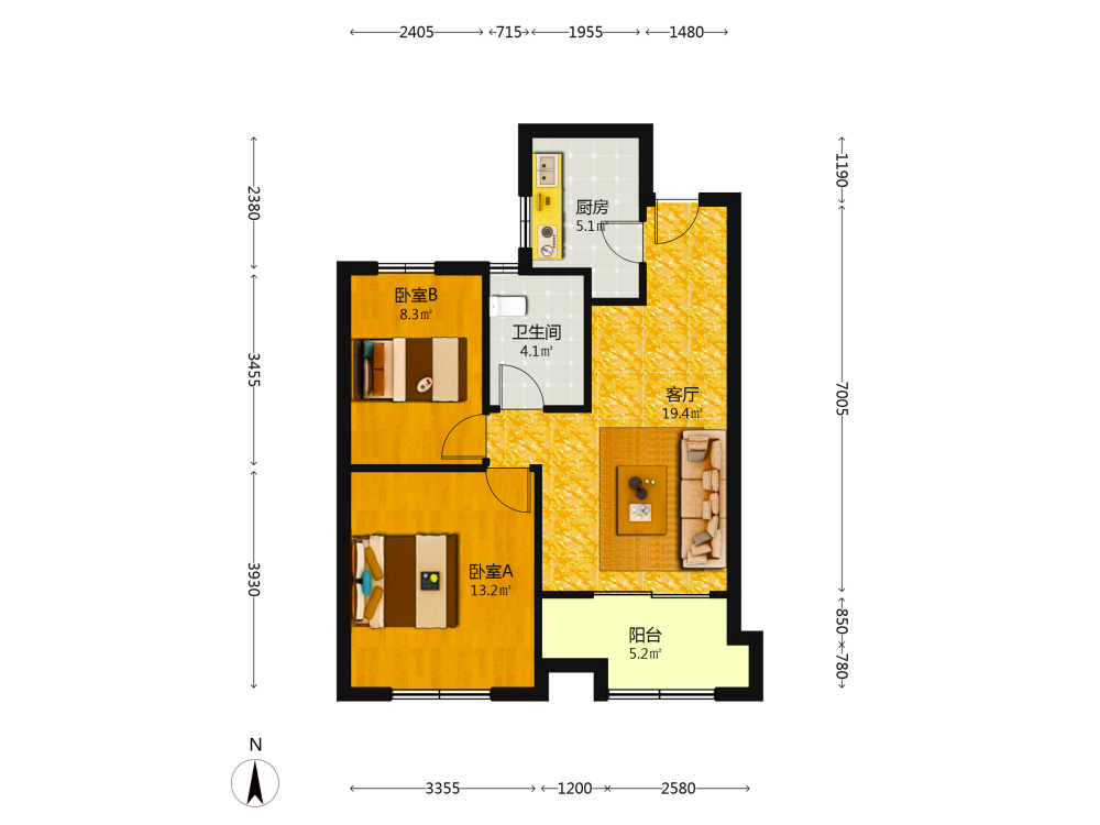 2室1厅1卫1厨1阳
