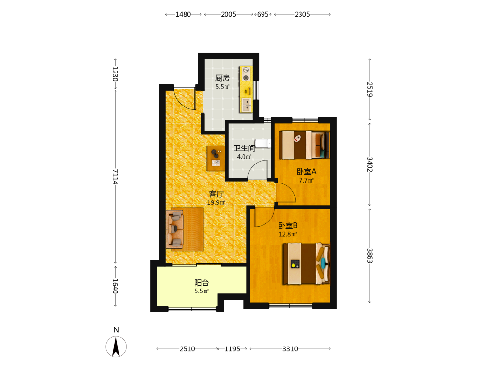 2室1厅1卫1厨1阳