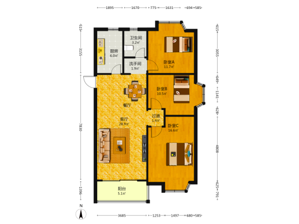 3室1厅1卫1厨1阳