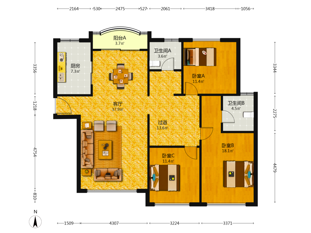 3室2厅2卫1厨1阳