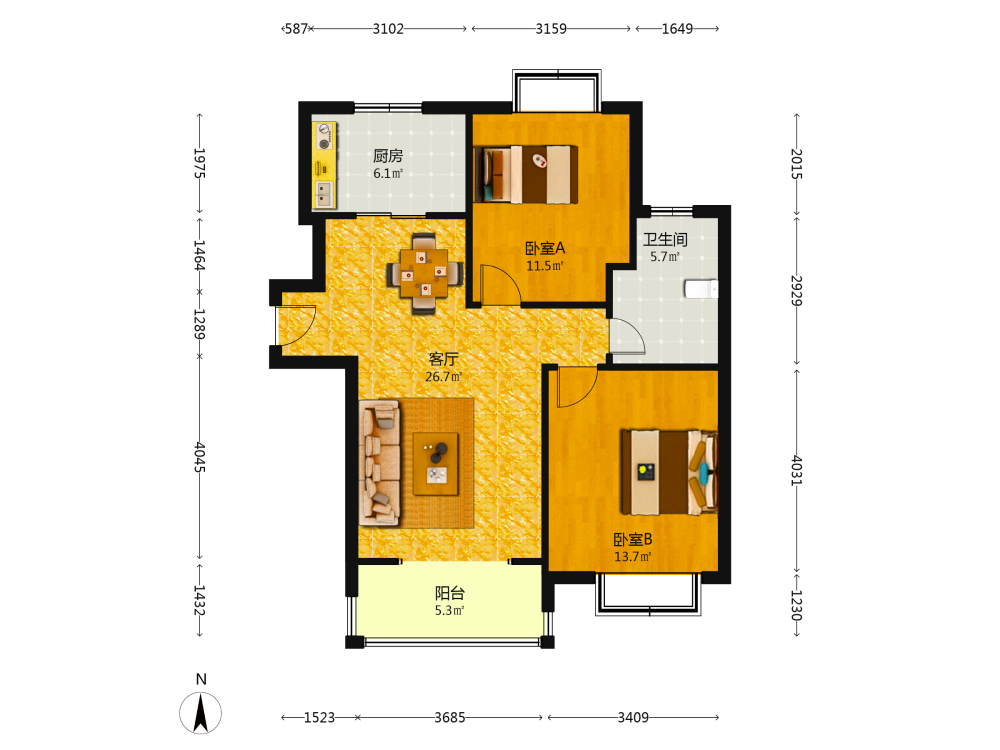 2室2厅1卫1厨2阳