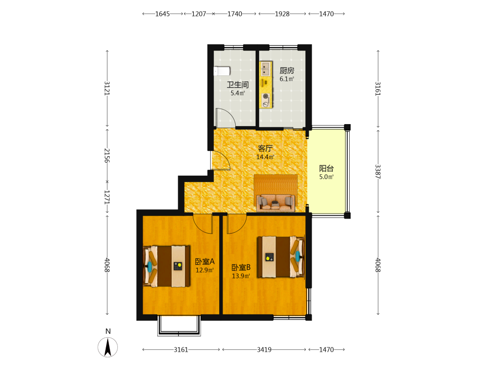 2室1厅1卫1厨1阳
