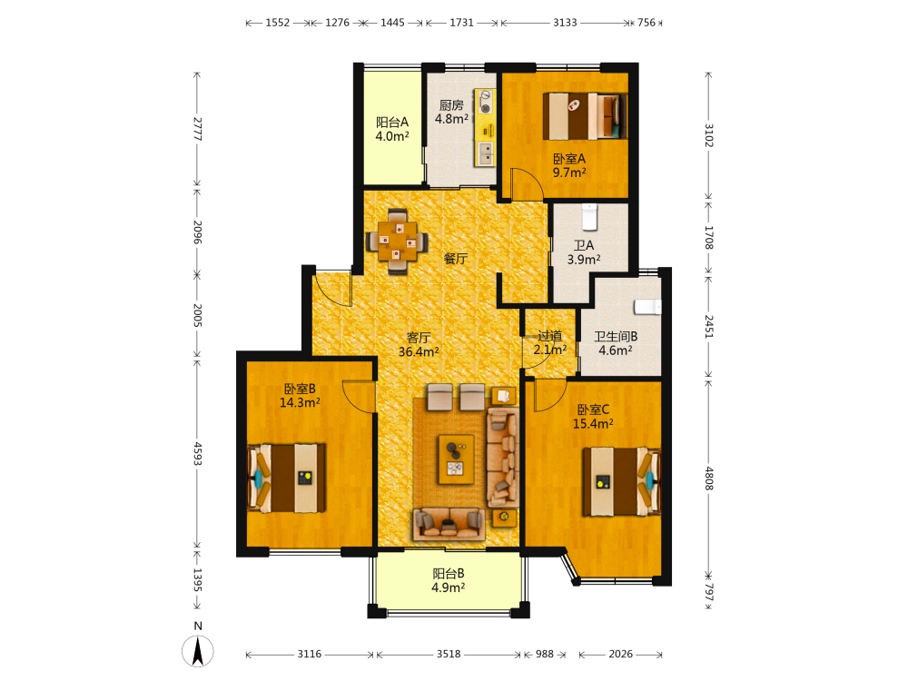 3室2厅1卫1厨1阳