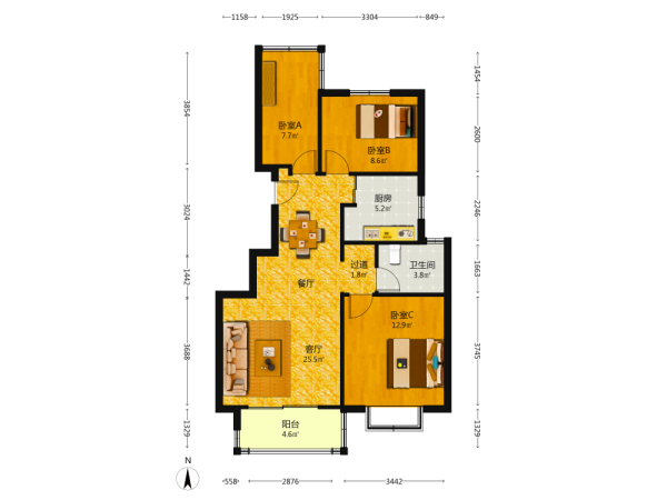 3室2厅1卫1厨1阳