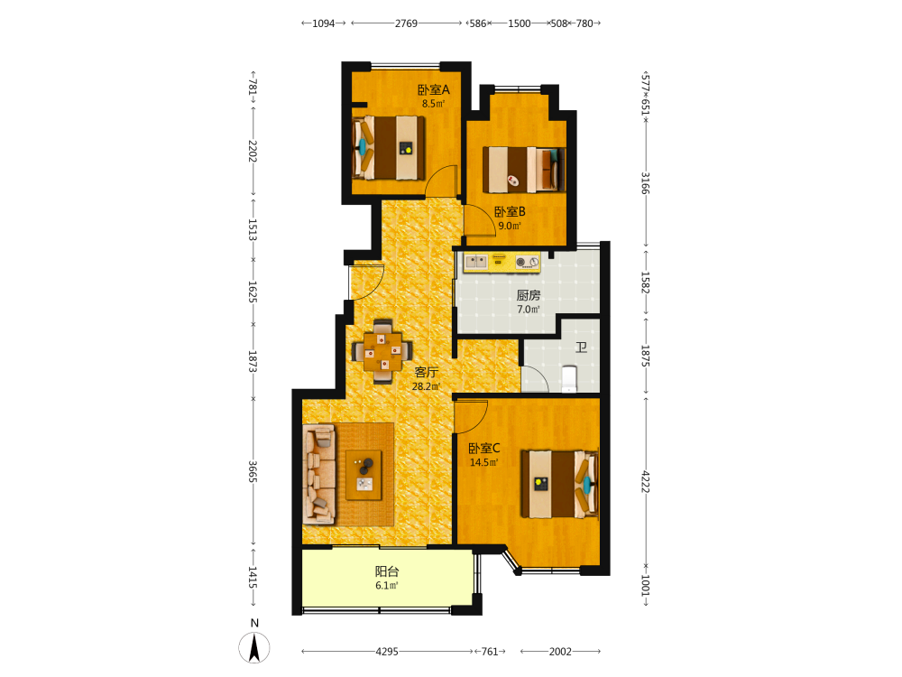 3室2厅1卫1厨1阳