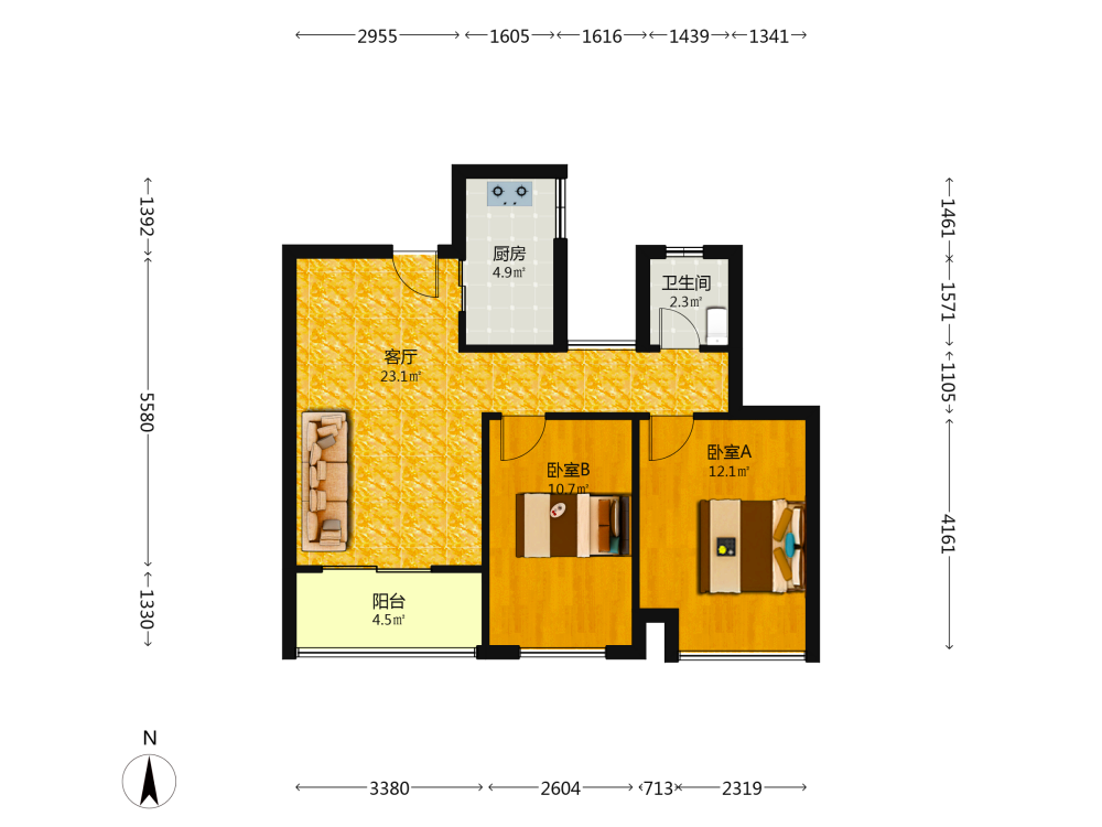 2室2厅1卫1厨1阳