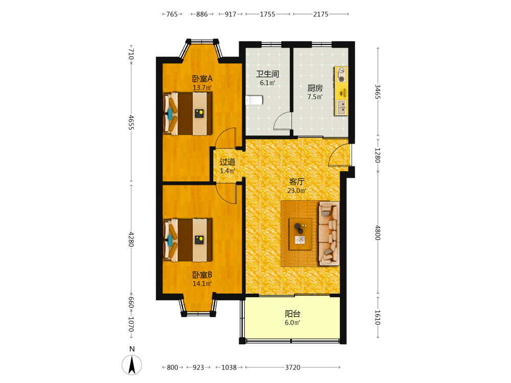 2室2厅1卫1厨1阳