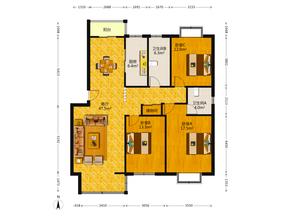 3室2厅1卫1厨1阳