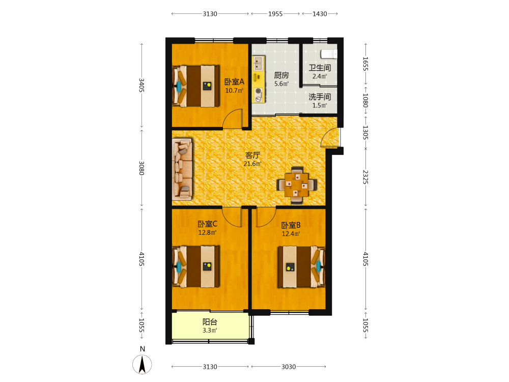 3室2厅1卫1厨1阳