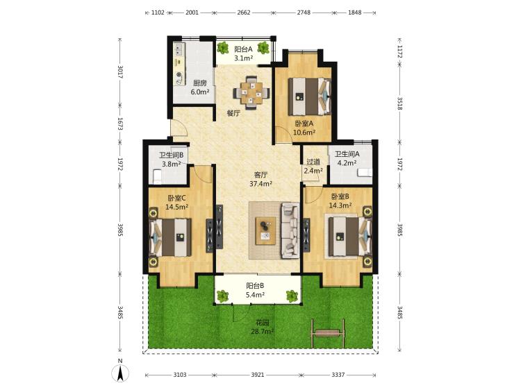 3室2厅2卫1厨1阳