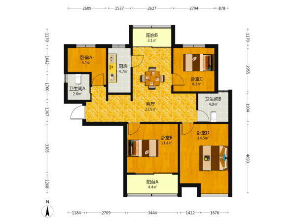 3室2厅1卫1厨1阳