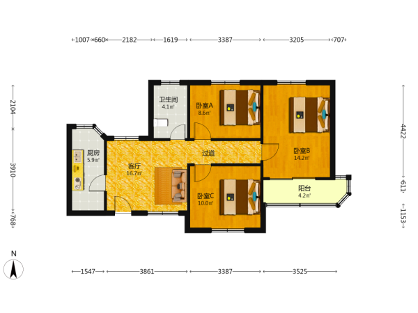 3室1厅1卫1厨1阳