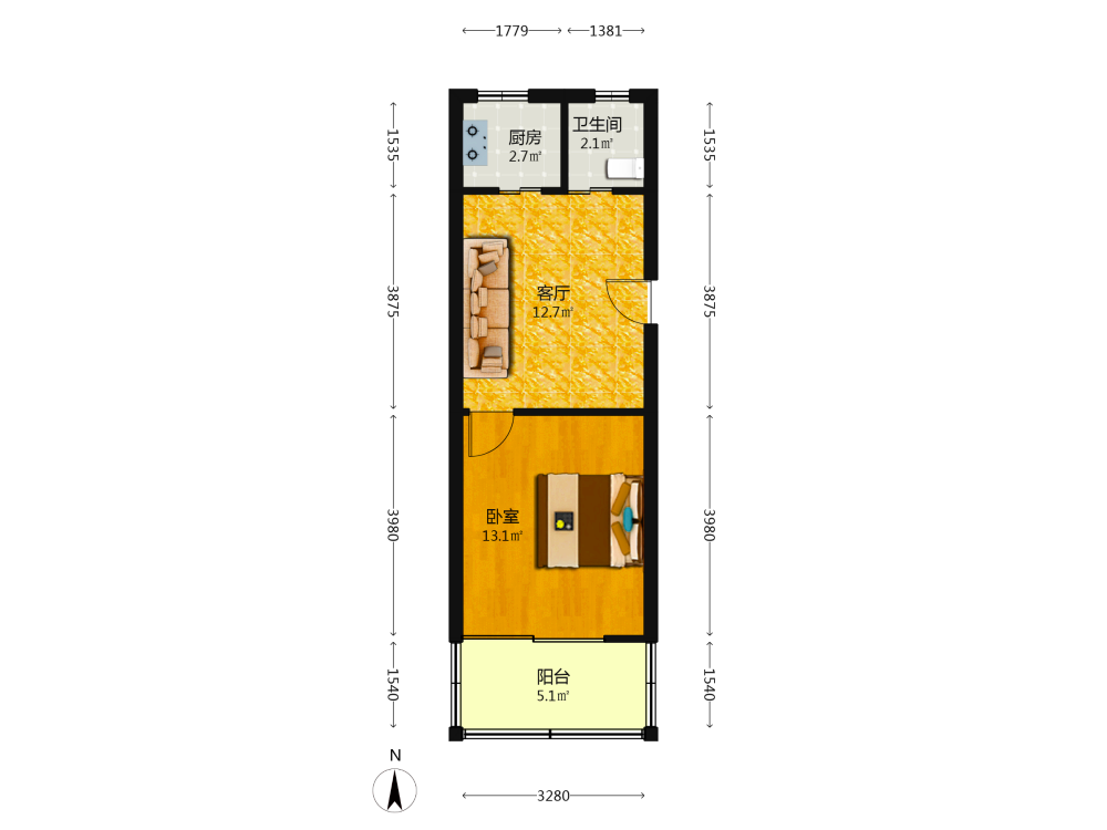 1室1厅1卫1厨1阳