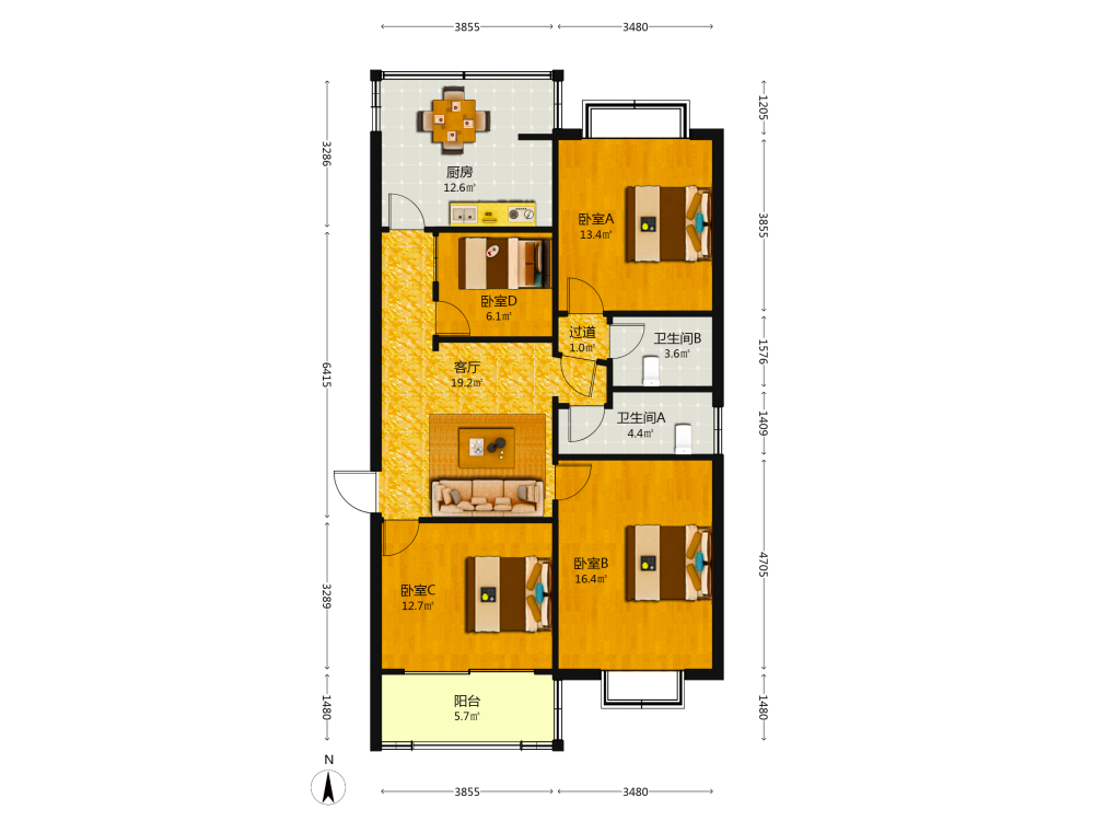 3室2厅1卫1厨1阳