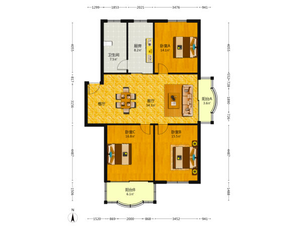 3室2厅1卫1厨1阳