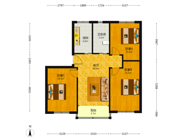 3室2厅1卫1厨1阳