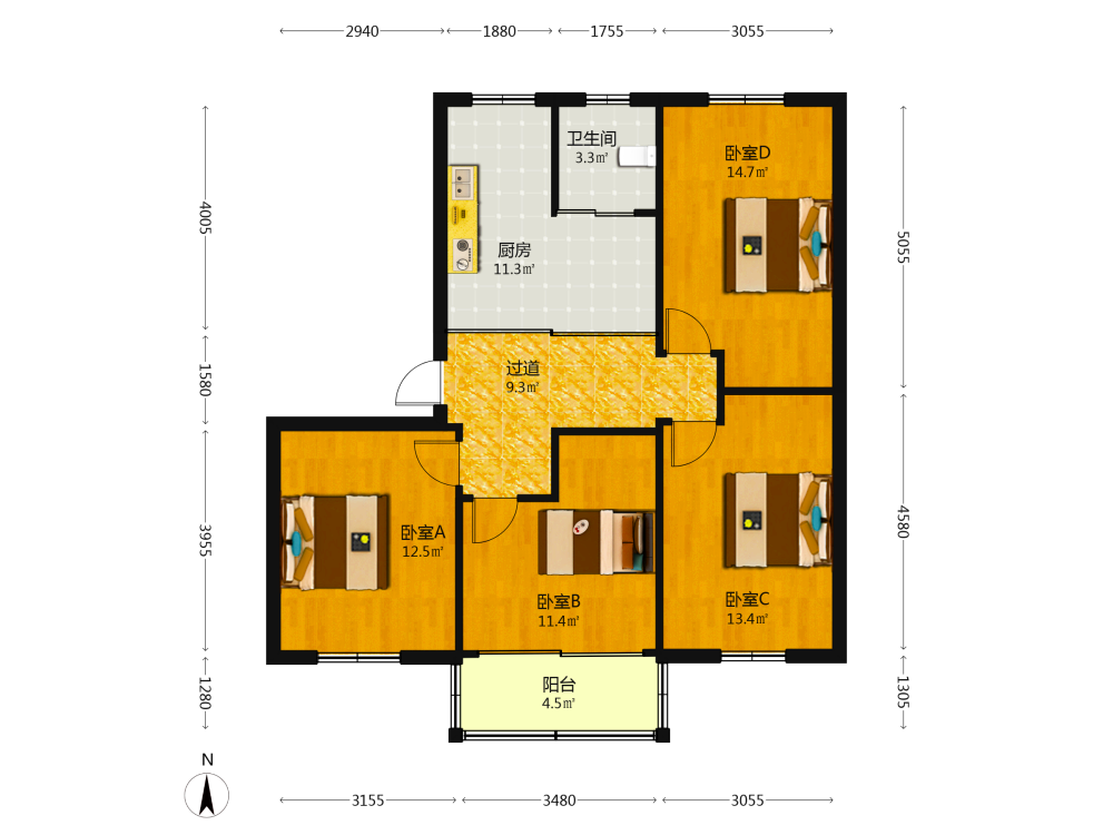 3室2厅1卫1厨1阳
