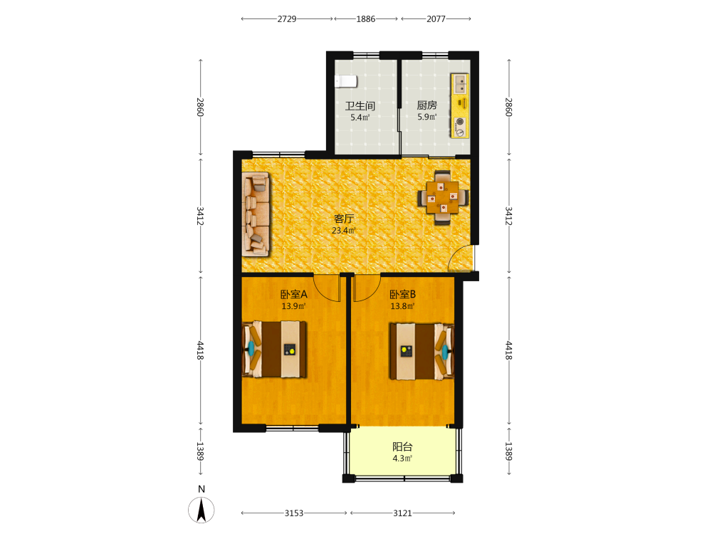 2室1厅1卫1厨1阳