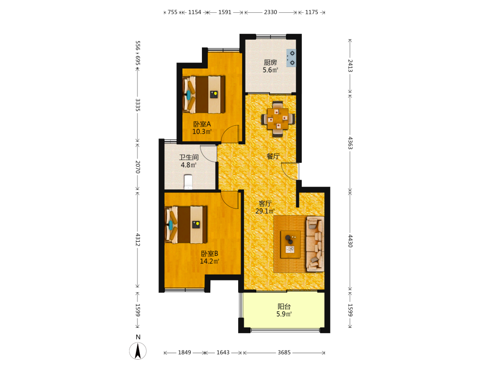 2室2厅1卫1厨1阳