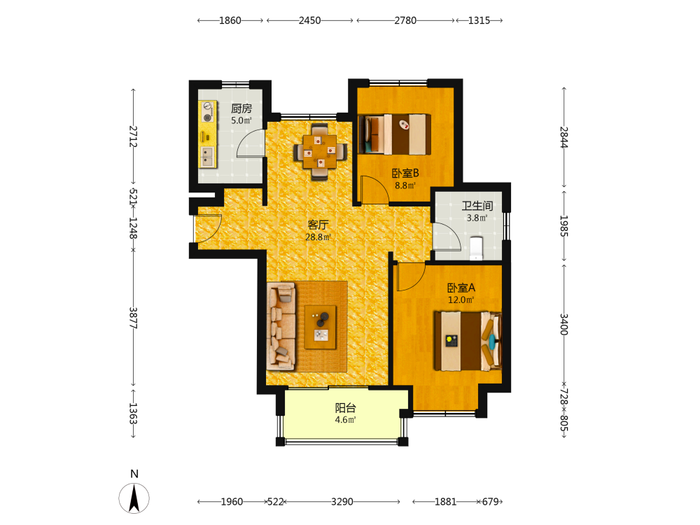 2室2厅1卫1厨1阳