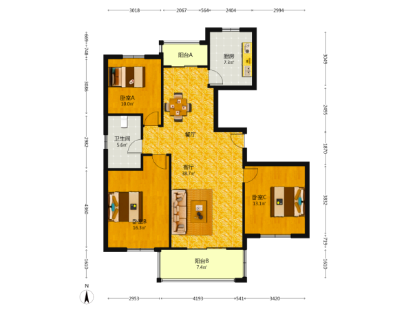 3室2厅1卫1厨1阳