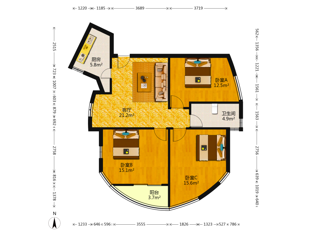 3室2厅1卫1厨1阳