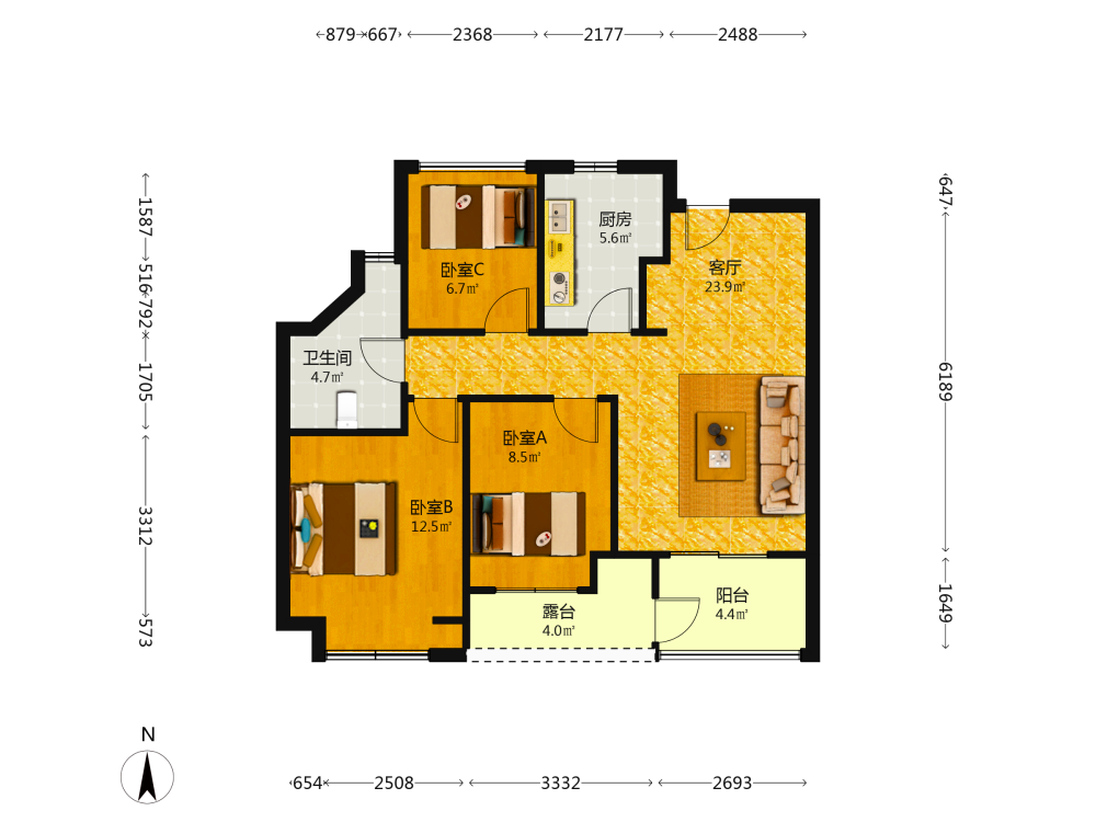 3室2厅1卫1厨1阳