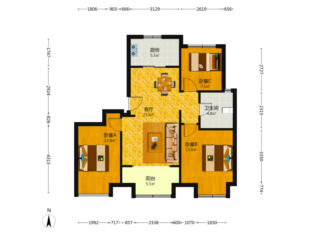 3室2厅1卫1厨1阳