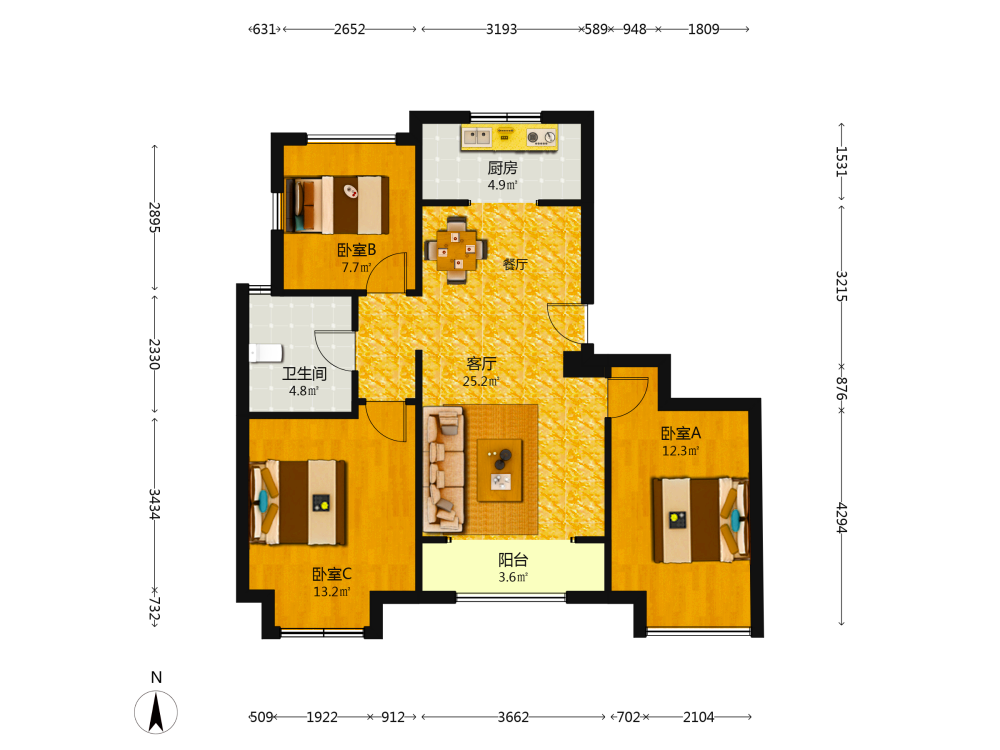 3室2厅1卫1厨1阳