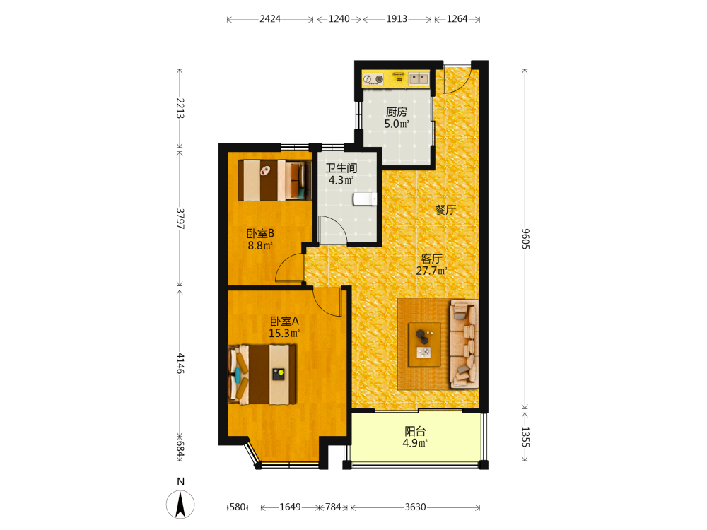 2室2厅1卫1厨1阳