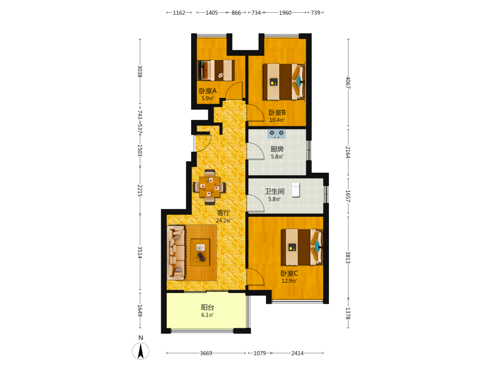 3室2厅1卫1厨1阳