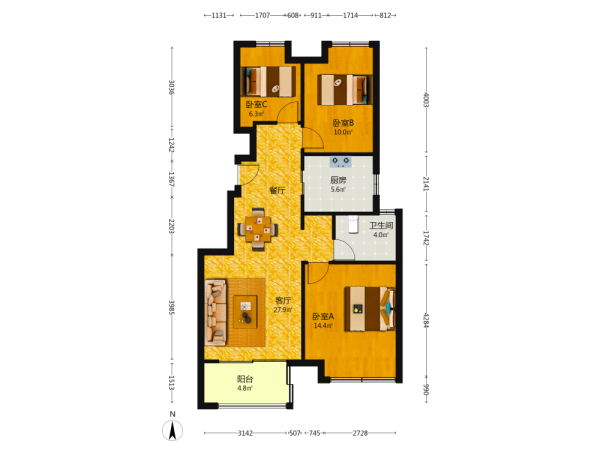 3室2厅1卫1厨1阳