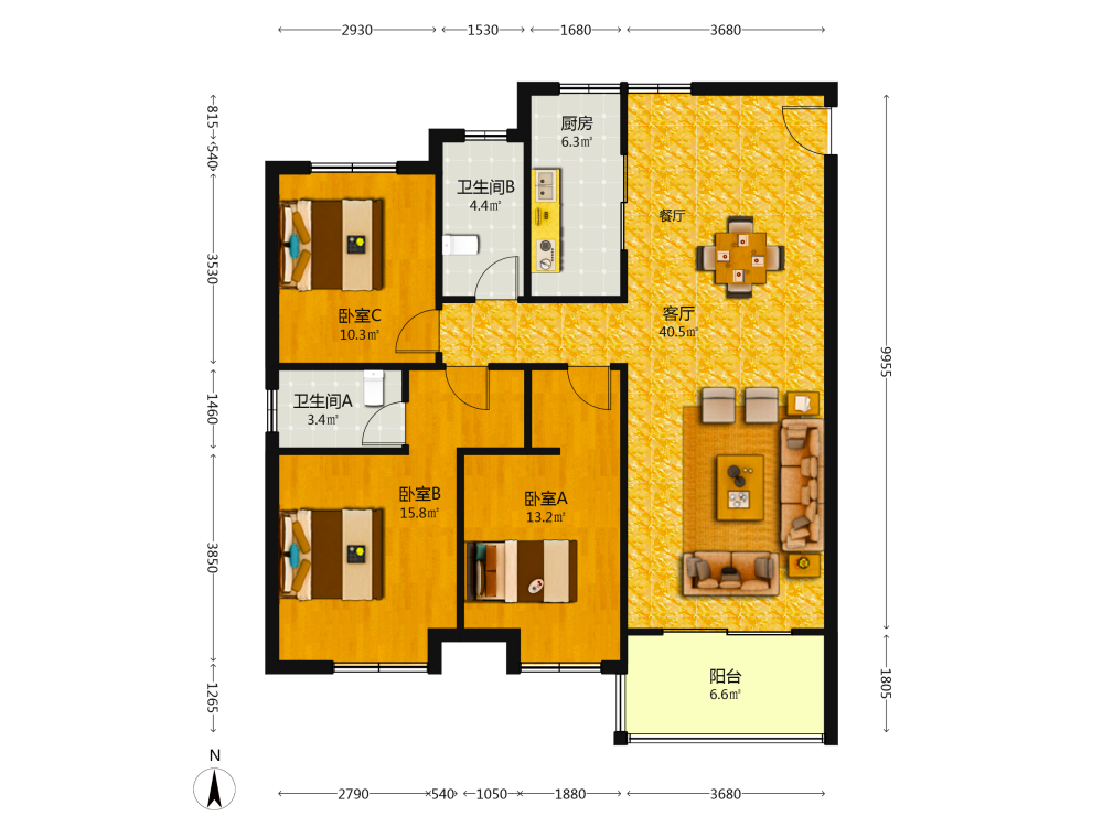 3室2厅1卫1厨1阳